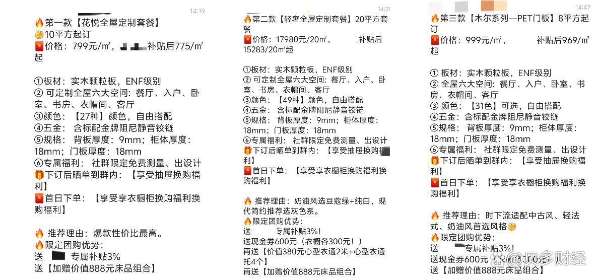 据当事人所述,其通过某互联网家装平台(下称“平台”)组织的团购群里参与了金牌家居的定制家具团购活动,宣称提供799元/㎡,999元/㎡和17980元/20㎡特惠套餐,用户还可享受现金券、专属补贴、免费赠礼等限定团购福利。