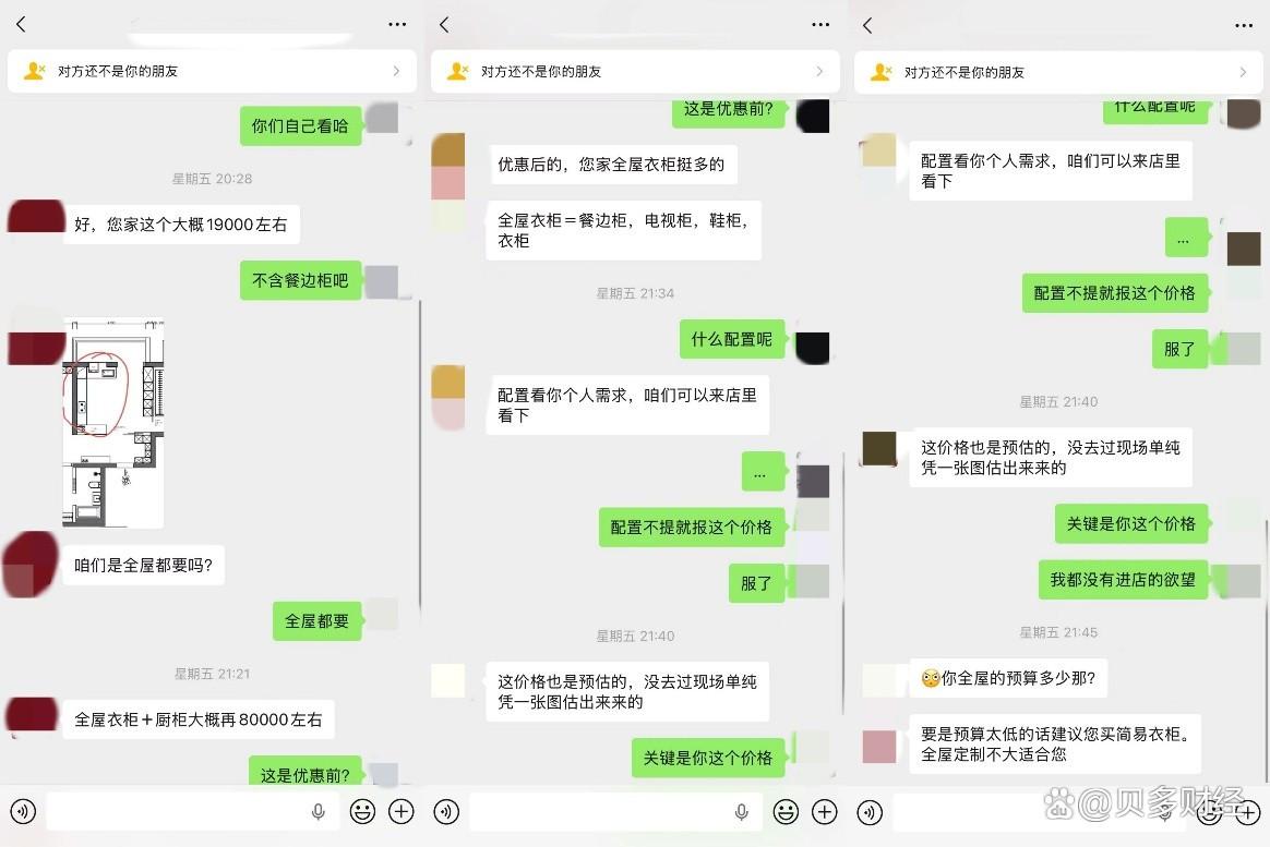 另一名金牌家居销售人员的态度,则更令人气愤。在当事人指出其优惠后报价偏高,且配置信息模糊不清时,这名销售竟直接以近乎嘲讽的口吻回应称“要是预算太低的话建议您买简易衣柜,全屋定制不大适合您”。