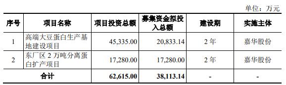 2022年8月30日,嘉华股份公布的首次公开发行股票招股说明书显示,公司拟募集资金38,113.14万元,分别用于高端大豆蛋白生产基地建设项目、东厂区2万吨分离蛋白扩产项目。