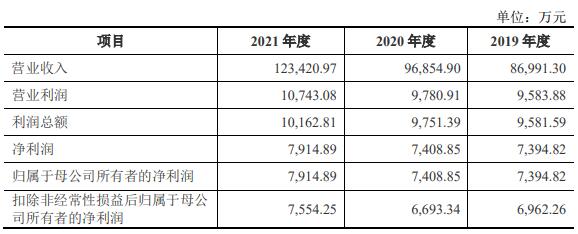 2019年-2021年,嘉华股份营业收入分别为86,991.30万元、96,854.90万元、123,420.97万元;净利润/归属于母公司所有者的净利润分别为7,394.82万元、7,408.85万元、7,914.89万元;扣除非经常性损益后归属于母公司所有者的净利润分别为6,962.26万元、6,693.34万元、7,554.25万元;经营活动产生的现金流量净额分别为11,218.85万元、10,973.25万元、4,334.45万元。