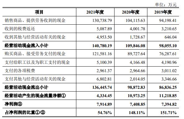 2019年-2021年,嘉华股份主营业务收入分别为86,796.84万元、96,606.56万元、122,992.87万元;销售商品、提供劳务收到的现金分别为94,198.41万元、104,115.63万元、130,738.79万元。