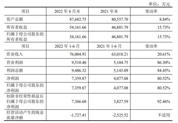 2022年1-6月,嘉华股份营业收入76,004.91万元,同比增长20.61%;净利润/归属于母公司股东的净利润7,359.87万元,同比增长80.52%;扣除非经常性损益后归属于母公司股东的净利润7,366.60万元,同比增长92.46%;经营活动产生的现金流量净额-1,727.41万元,上年同期为-2,525.52万元。