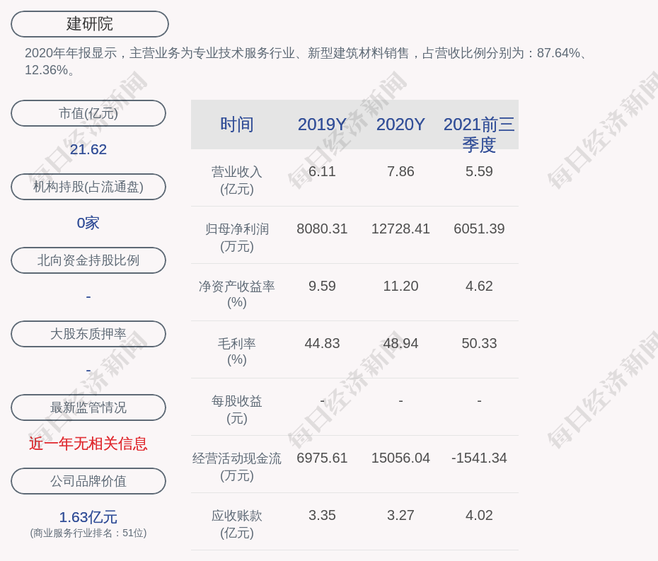 2020年年报显示,建研院的主营业务为专业技术服务行业、新型建筑材料销售,占营收比例分别为:87.64%、12.36%。