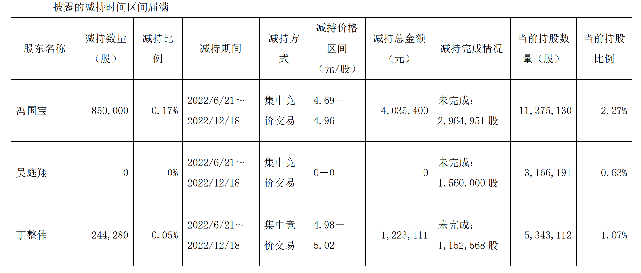 公告显示,截止2022年12月18日,本次减持计划时间已届满,股东冯国宝实际减持股份850,000股(2021年年度利润分配除权后,占公司当前总股本的0.17%)。截止2022年12月18日收盘,冯国宝持有公司股份11,375,130股,占公司当前股份的2.27%。