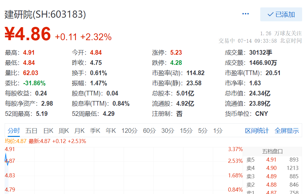 7月14日,截至9:33,建研院(603183.SH)股价涨2.32%,报4.86元,总市值为24.34亿元。