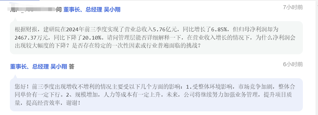 有投资提问,2024年前三季度,建研院在营业收入增长的情况下,为什么净利润会出现较大幅度的下降。吴小翔表示,前三季度出现增收不增利的情况主要受以下几个方面的影响:1、受整体环境影响,市场竞争加剧,整体合同单价有一定下行;2、规模增加,人力等成本有一定上升。未来,公司将继续努力加强业务管理,提升项目质量,提高经营效率。