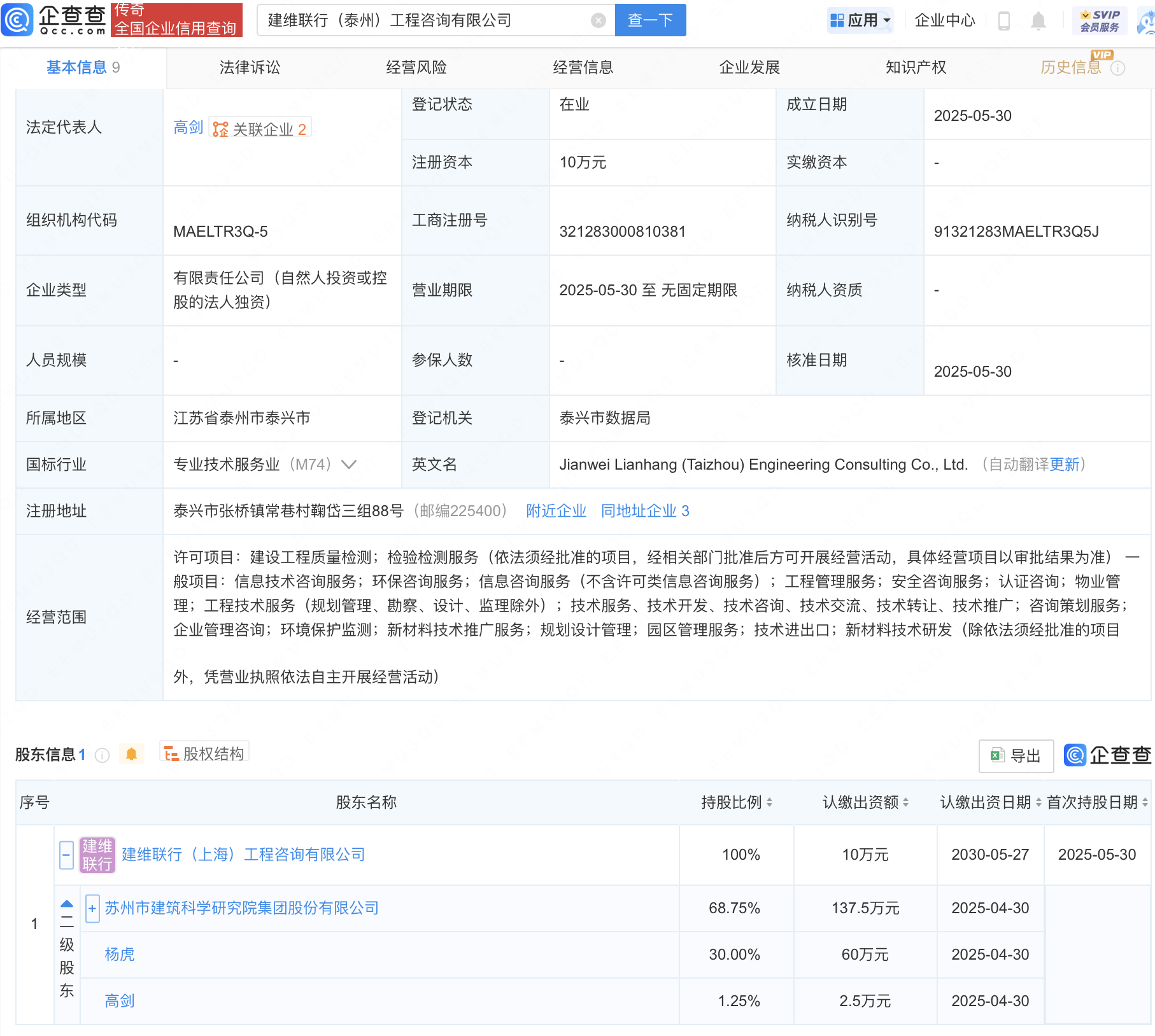 近日,建维联行(泰州)工程咨询有限公司成立,法定代表人为高剑,经营范围包含:环境保护监测;新材料技术推广服务;规划设计管理;园区管理服务等。企查查股权穿透显示,该公司由建研院(603183)旗下建维联行(上海)工程咨询有限公司全资持股。