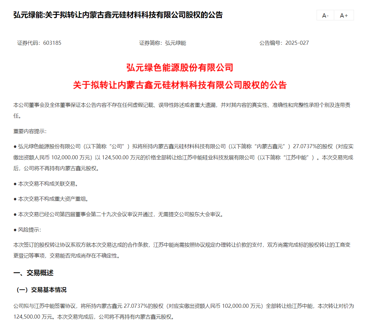 5月7日,弘元绿能发布公告披露,拟与江苏中能硅业科技发展有限公司签署协议,将所持内蒙古鑫元硅材料科技有限公司27.07%的股权全部转让给江苏中能,转让对价为12.45亿元。交易完成后,弘元绿能将不再持有内蒙古鑫元股权。