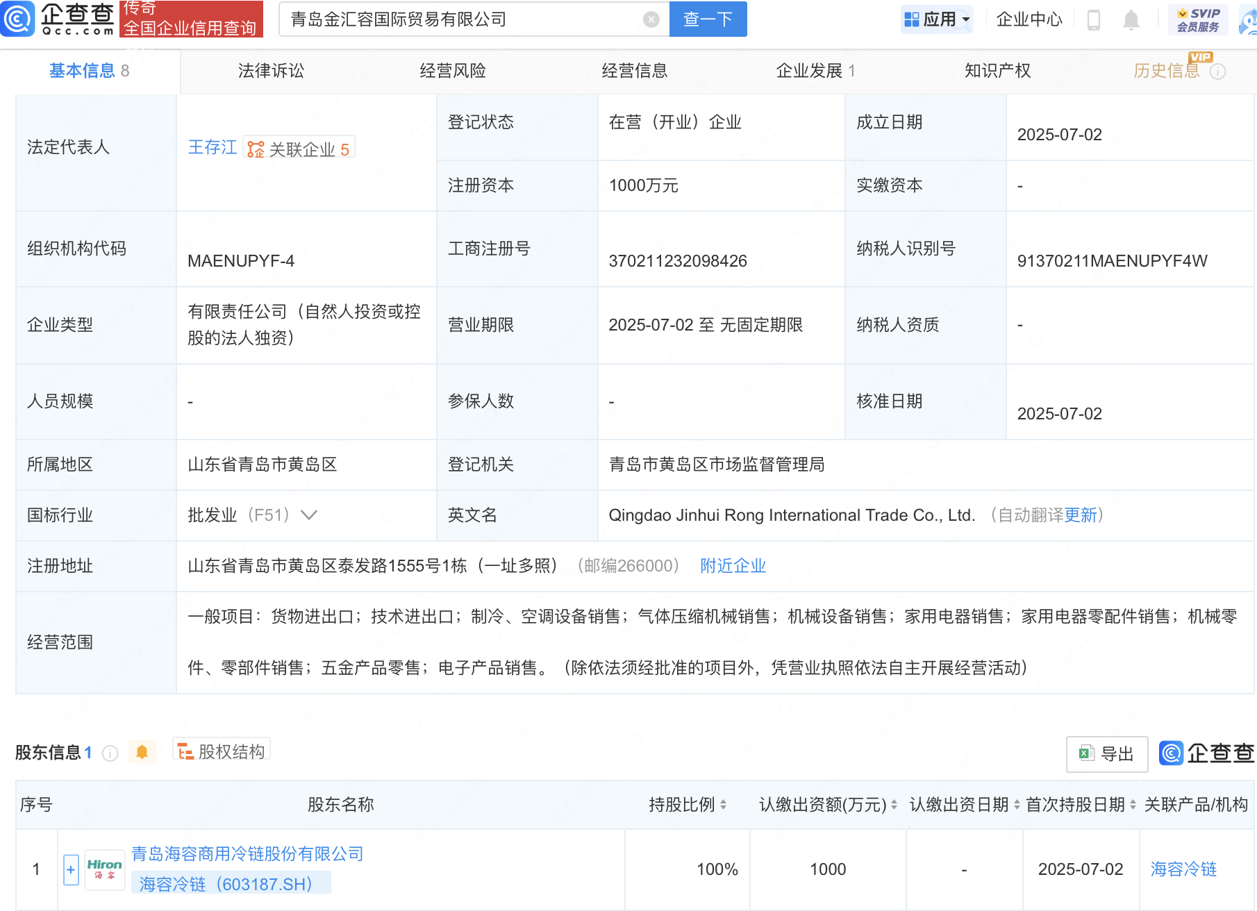 近日,青岛金汇容国际贸易有限公司成立,法定代表人为王存江,经营范围包含:气体压缩机械销售;机械设备销售;家用电器销售;家用电器零配件销售等。股权穿透显示,该公司由海容冷链(603187)全资持股。