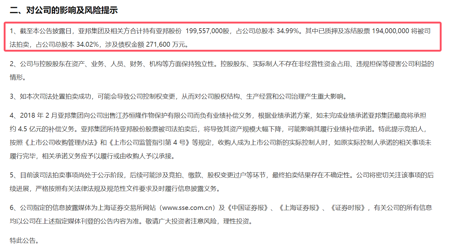 同时,亚邦股份也表示,如本次司法处置拍卖成功,可能会导致公司控制权变更,从而对公司股权结构、生产经营和公司治理产生重大影响。