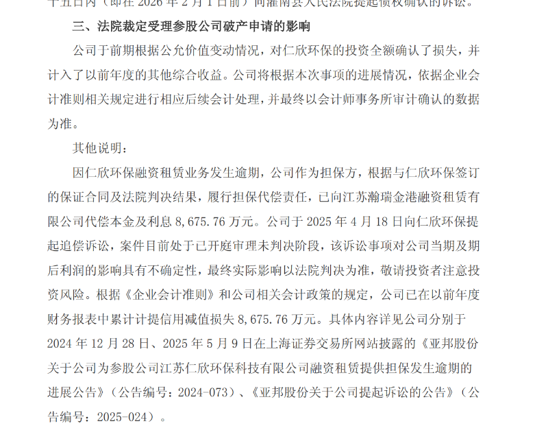 值得关注的是, 亚邦股份 还在公告中指出因仁欣环保融资租赁业务发生逾期,公司作为担保方,根据与仁欣环保签订的保证合同及法院判决结果,履行担保代偿责任,已向 江苏瀚瑞金港融资租赁有限公司 代偿本金及利息 8,675.76 万元。