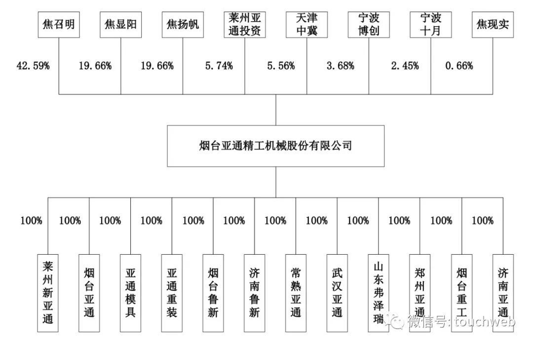亚通精工的控股股东、实际控制人为焦召明、焦显阳、焦扬帆家族三人。焦显阳系焦召明之子,焦扬帆系焦召明之女。