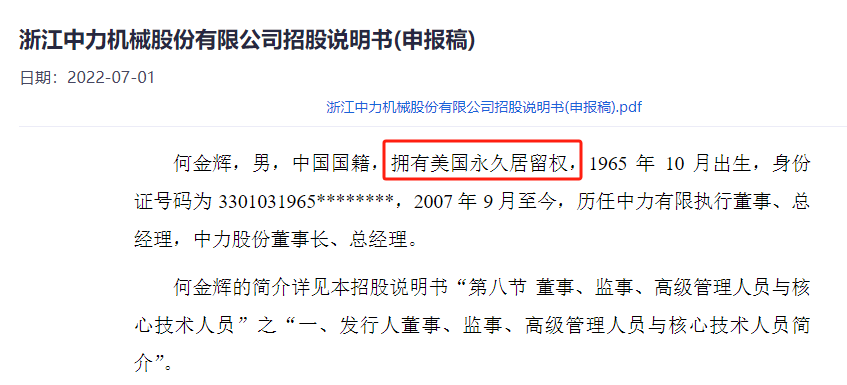 值得注意的是,据2022年7月1日中力股份披露的招股书(申报稿)显示,何金辉“拥有美国永久居留权”,但2024年4月15日披露的招股书(注册稿)中,中力股份却删除了何金辉“拥有美国永久居留权”这一描述。