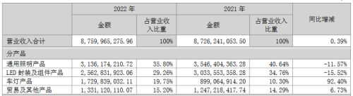 而在车灯产品业务方面,佛山照明在2022年实现了17.30亿元的营收,同比提升92.40%,占总营收比重从2021年的10.30%上升至19.75%。
