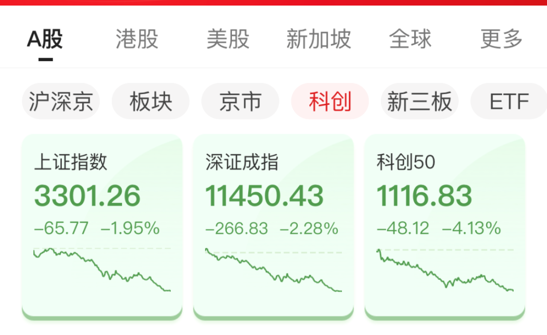 截至当日收盘,上证指数跌1.95%,报3301.26点;深证成指跌2.28%,报11450.43点;科创50指数跌4.13%,报1116.83点;创业板指跌1.91%,报2341.19点。