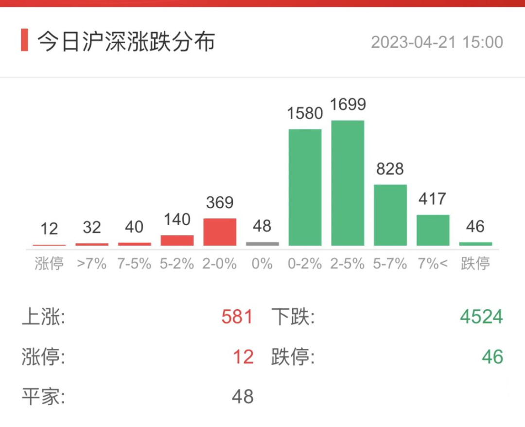 沪深京三市4524只个股下跌,其中跌幅超5%的多达千余只,飘红个股仅581只。