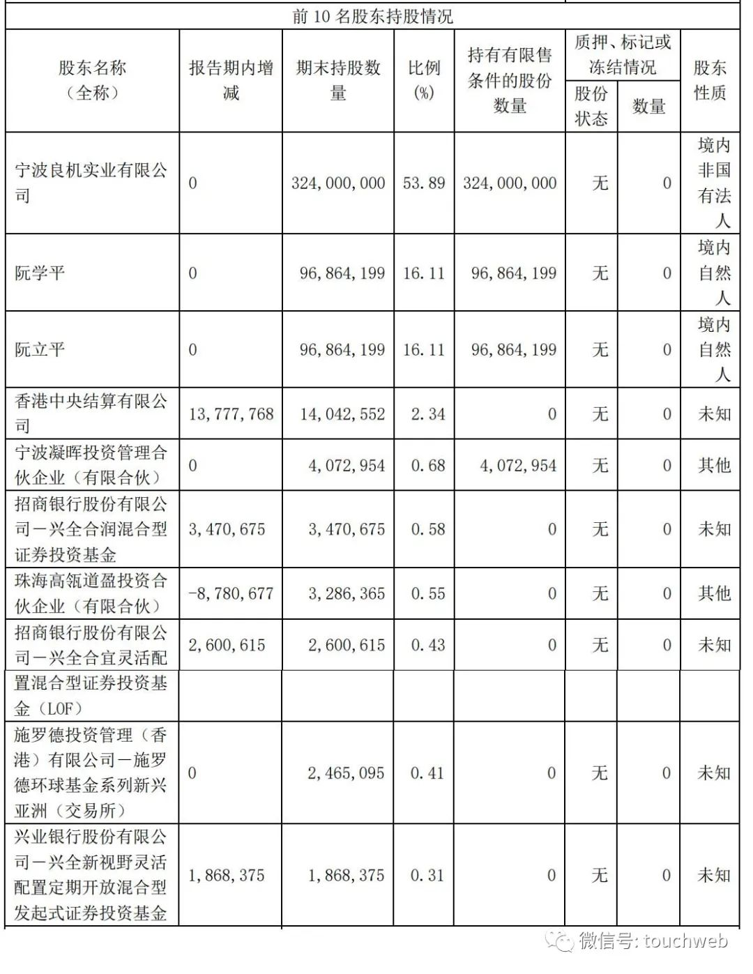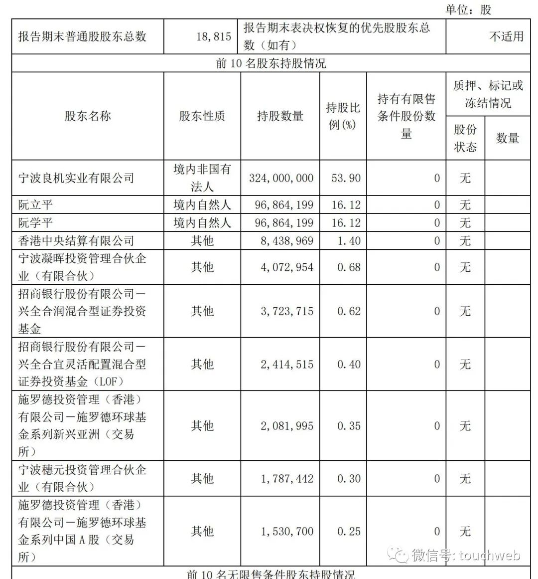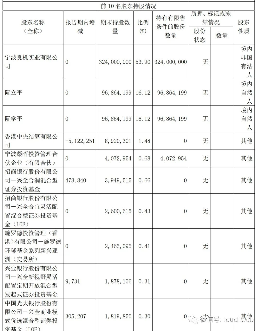 截至2023年3月31日,宁波良机实业有限公司持股为53.9%,阮学平、阮立平分别持股为16.12%,香港中央结算有限公司持股为1.4%,宁波凝晖投资管理合伙企业(有限合伙)持股为0.68%;
