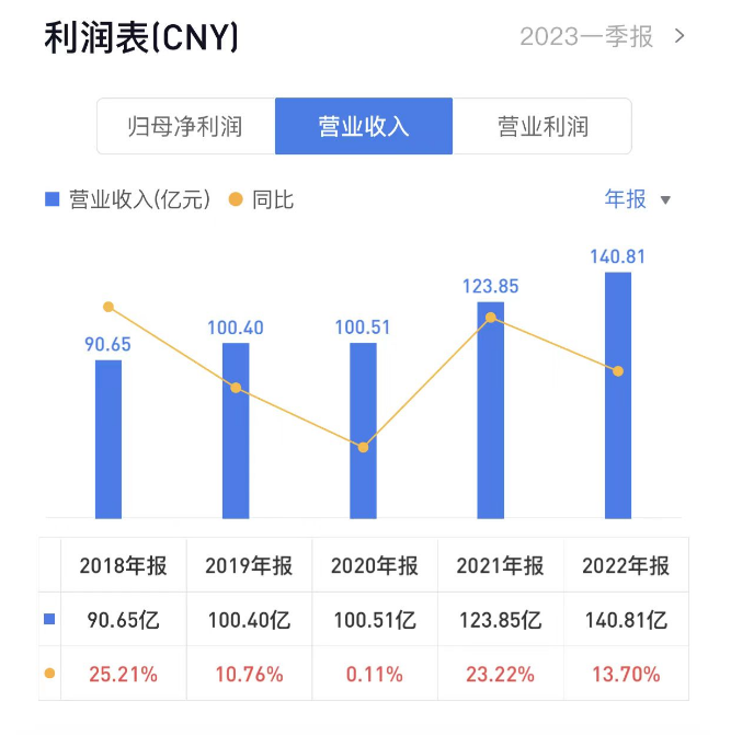 资料显示,2018年-2022年,公牛集团营业收入分别为90.65亿元、100.4亿元、100.51亿元、123.85亿元、140.81亿元,分别同比增加25.21%、10.76%、0.11%、23.22%、13.7%。