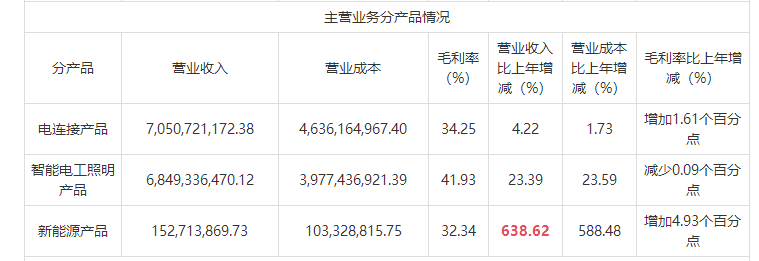 公牛集团2022年年报称,凭借多年用电技术和品牌优势的积累,公司新能源业务开展顺利,全年实现收入1.53亿元,同比增长638.62%。