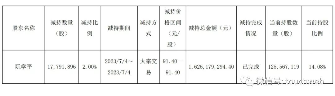 阮学平此次是通过大宗交易的方式减持,减持均价为91.4元,一共套现16.26亿元。