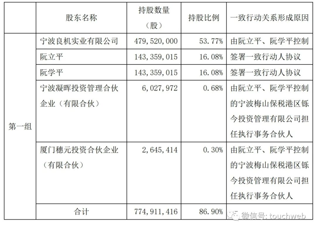 阮学平与一致行动人宁波良机实业有限公司、阮立平、宁波凝晖投资管理合伙企业(有限合伙)、厦门穗元投资合伙企业(有限合伙)合计持有公司股份774,911,416股,占公司总股本的86.89%。