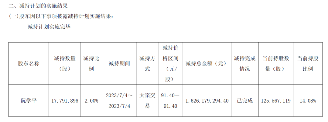 7月,公司公告阮学平通过大宗交易合计减持公司股份17791896股,占公司总股本的2%,减持价格为91.4元/股,减持总金额16.26亿元。