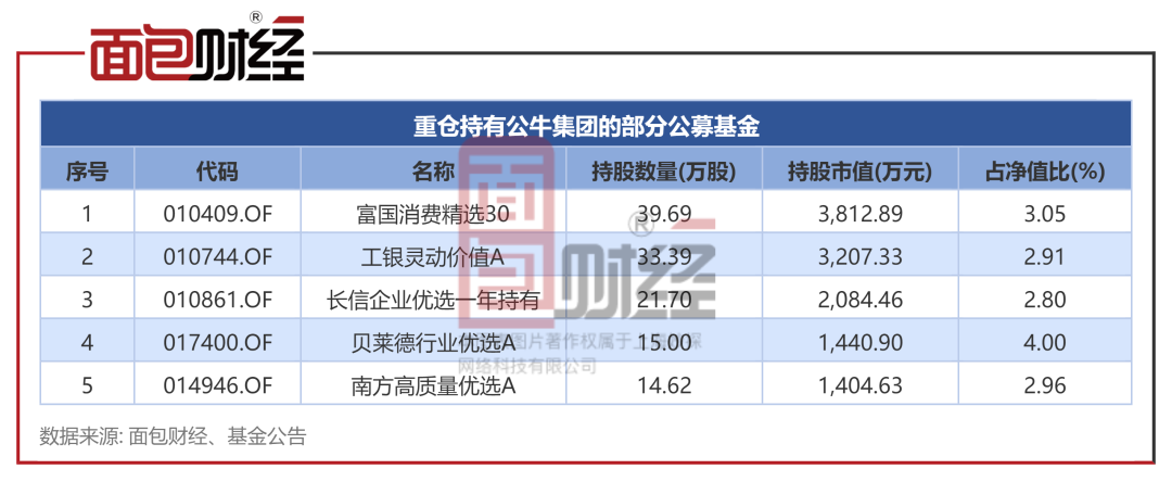 重仓公牛集团的公募基金中,富国消费精选30股票持有数量居前,二季度末持有公牛集团39.69万股,公允价值约0.38亿元,占基金资产净值的3.05%。