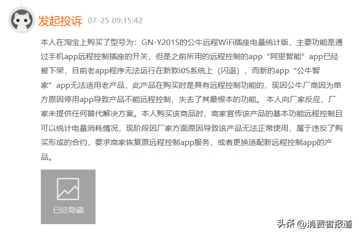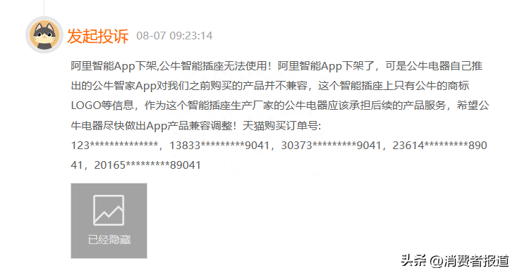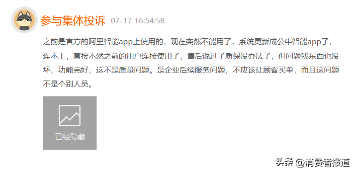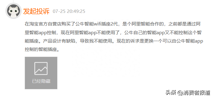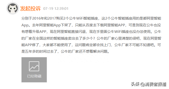 记者在黑猫投诉平台注意到多起类似的投诉。该事件也迅速发酵成一起集体投诉。这意味着,阿里智能APP下架以后,有多名于早前购买了公牛智能插座的消费者受到影响。
