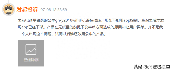 也有消费者质疑公牛在全国范围卖出多个智能插座,但在配套APP停用后没有积极处理问题。