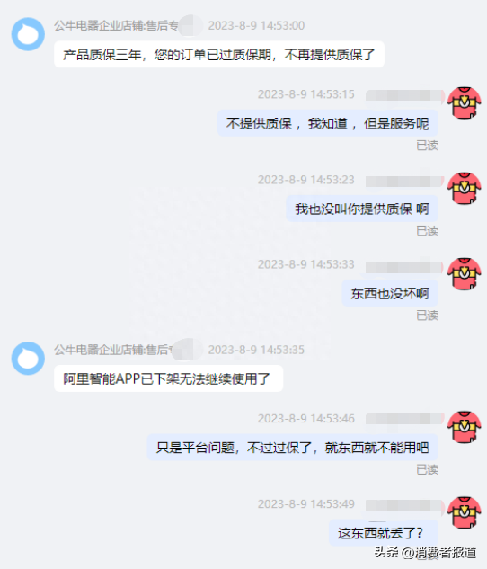 彭先生提供的聊天记录显示,客服称产品的质保期为三年,订单已过质保期,不能提供质保服务。但彭先生称他并不是要求公牛方面提供质保,因为插座根本没有损坏,只是APP的适配问题。他认为公牛方面应该对公牛智家APP进行升级,兼容老款设备。
