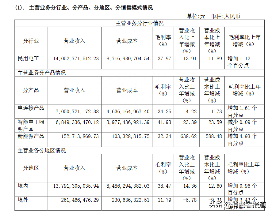 公牛集团2022年年度报告显示,电连接产品作为公司的核心业务,依靠品牌优势及五金渠道优势保持平稳增长,主营业务收入为70.51亿元,同比增长4.22%。毛利率为34.25%,较去年增加1.61个百分点。