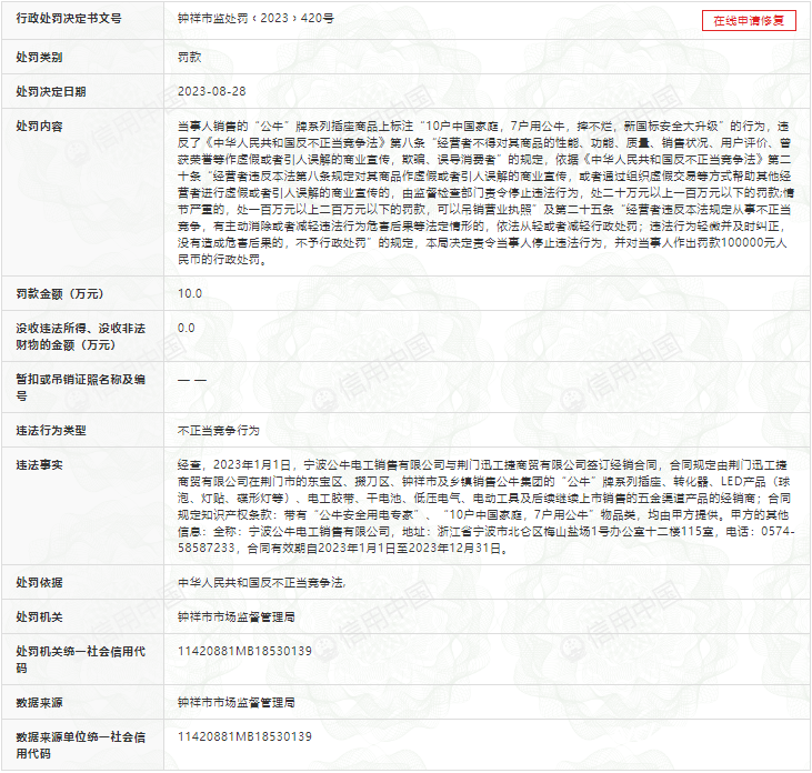信用中国显示,近日,公牛集团全资子公司宁波公牛电工销售有限公司因不正当竞争行为,对其商品作虚假或者引人误解的商业宣传,被钟祥市市场监督管理局罚款10万元。