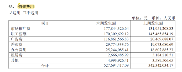 半年报显示,公牛集团的市场推广费为1.78亿;广告费为1.17亿;差旅费为2977.43万。根据公牛集团披露的信息表格可见,销售费用中增幅最大的是广告费,上期发生额仅为2046.97万,相较于本期增长了9639.19万。