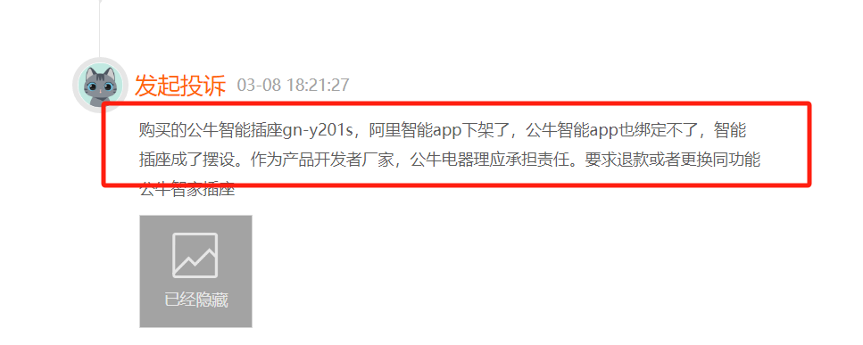 多名消费者投诉称,阿里智能APP下架以后,公牛的智能插座成了“摆设”。