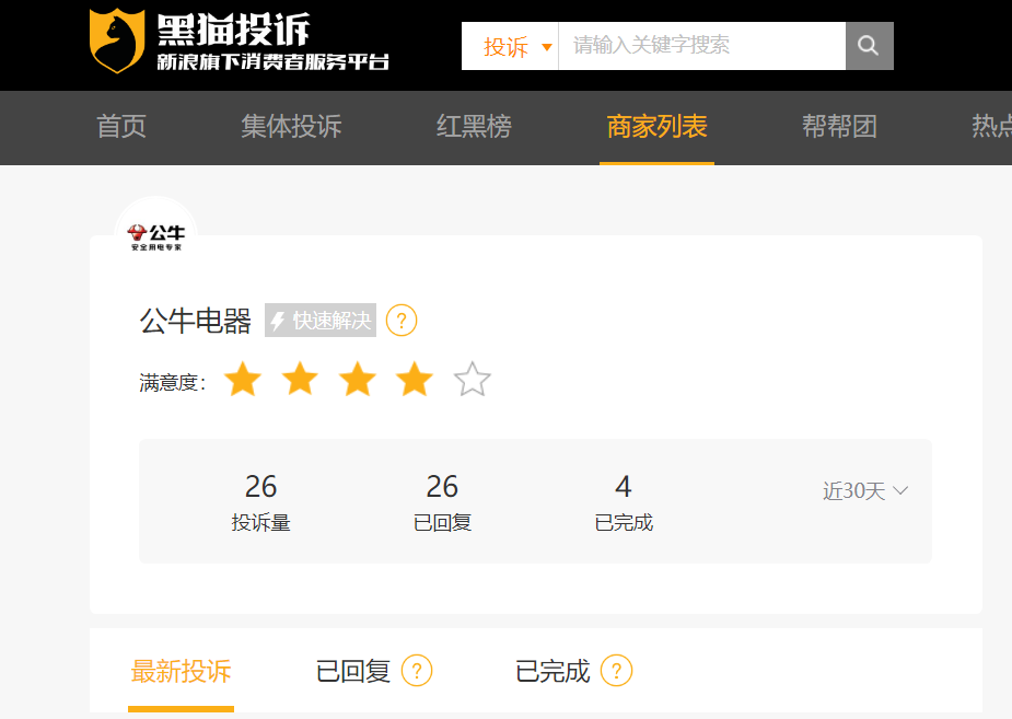 3月13日,据黑猫投诉平台,近30天,公牛电器新增26条投诉,目前已完成4起,投诉问题多涉及产品质量。