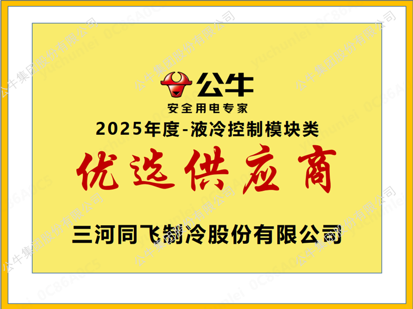 近日,同飞股份凭借在液冷控制模块领域的卓越表现,荣获公牛授予的“2025 年度-液冷控制模块类优选供应商”称号。这一荣誉是对同飞股份产品质量、技术创新及服务水平的高度认可。