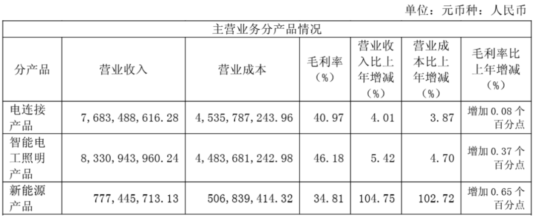 2024年,公牛集团新能源产品的毛利率为34.81%,远不及电连接产品、智能电工照明产品40.97%、46.18%的毛利率。