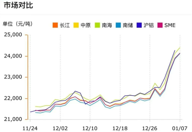 以1月7日市场价格为例,铝材价格上涨230元/吨,价格范围突破24000元/吨关口;铜价表现更为抢眼,国内外多个市场价格同步上涨,核心价格均创下新高,其中沪铜主连价格报104780元/吨,上涨1480元,涨幅达1.43%。