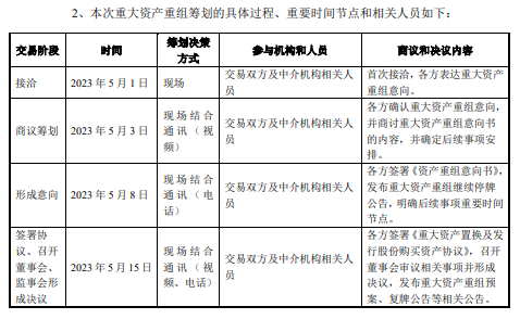 回函公告中,日播时尚披露了此次重大资产重组筹划的具体过程、重要时间节点。根据公告信息,交易双方及中介机构相关人员首次接洽的时间是2023年5月1日,商议和决议内容是“各方表达重大资产重组意向”;5月3日进行商议筹划,各方确认重大资产重组意向,并商讨重大资产重组意向书的内容,并确定后续事项安排;5月8日“形成意向”,各方签署《资产重组意向书》,发布重大资产重组继续停牌公告,明确后续事项重要时间节点;5月15日各方签署《重大资产置换及发行股份购买资产协议》,召开董事会审议相关事项并形成决议,发布重大资产重组预案、复牌公告等相关公告。