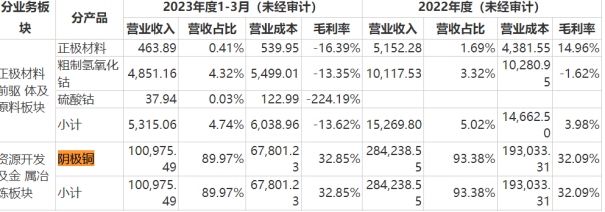 虽然重组预案宣称标的公司主营业务为新能源电池正极前驱体材料及上游关键矿产资源一体化的研究、开发和制造业务,但2020年至2022年以及2023年前三个月,其正极材料的各期销售占比不足2%,核心收入来自所处传统金属冶炼领域的阴极铜,收入占比约九成。