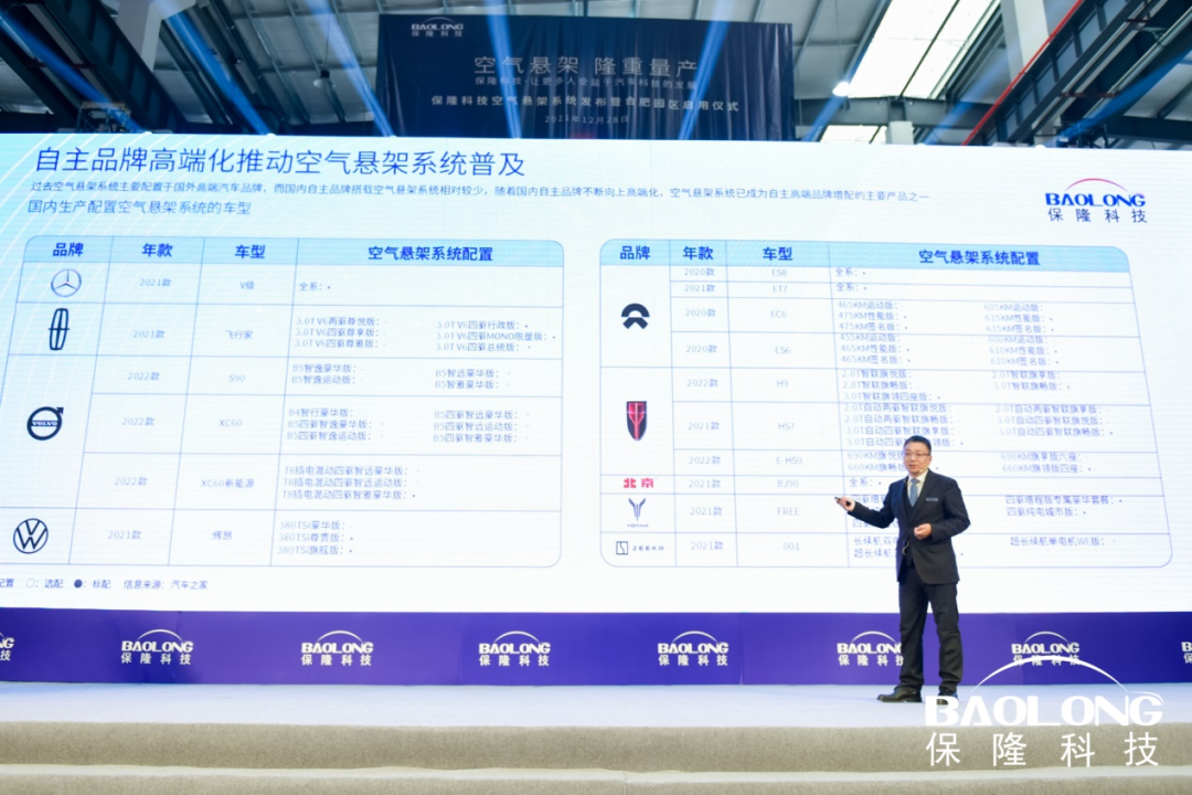 在下线仪式现场,保隆科技董事长陈洪凌感慨道:“空气悬架项目,从2012年启动至今正好十年,保隆科技攻克了重重难关,突破了国外巨头的技术垄断,打造空气悬架民族品牌,为多家国内新能源头部车企配套,成为中国空气悬架龙头企业。”