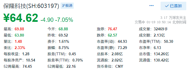 1月19日,截止10:50分,保隆科技(SH603197)下跌7.05%,现报64.62元,成交额2.13亿元,总市值134.26亿元。