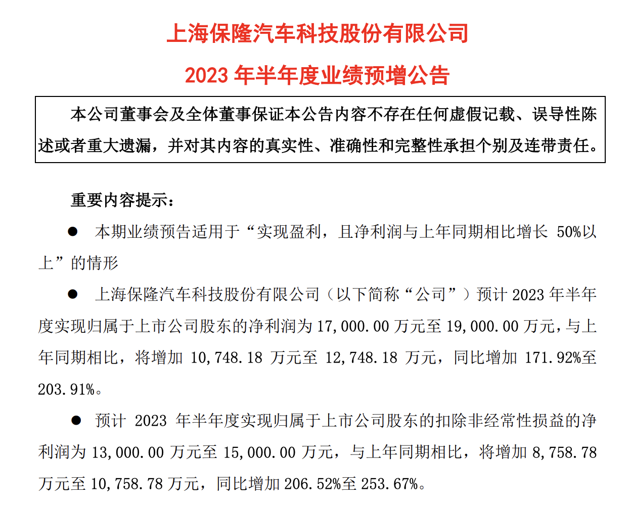 日前,保隆科技(603197.SH)公布了2023年半年度业绩预增公告,预计公司2023年上半年实现归属于上市公司股东的净利润为1.7亿~1.9亿元,同比增加172%~204%;实现归属于上市公司股东的扣除非经常性损益的净利润为1.3亿~1.5亿元,同比增加207%~254%。