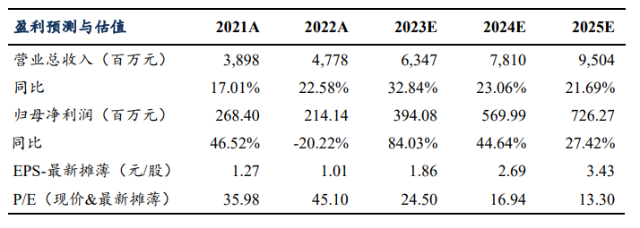 我们维持公司2023-2025年营收预测为63.47/78.10/95.04亿元,同比分别+33%/+23%/+22%;维持2023~2025年归母净利润预测为3.94/5.70/7.26亿元,同比分别+84%/+45%/+27%,对应PE分别为25/17/13倍,维持“买入”评级。