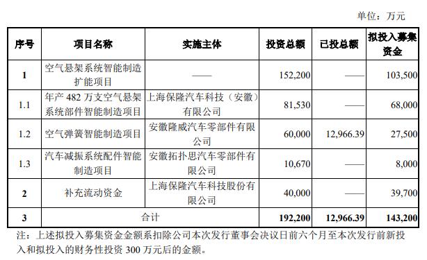 保隆科技发布的募集说明书显示,本次可转债预计募集资金总额不超过人民币143,200.00万元(含本数),扣除发行费用后拟用于空气悬架系统智能制造扩能项目(年产482万支空气悬架系统部件智能制造项目、空气弹簧智能制造项目、汽车减振系统配件智能制造项目)、补充流动资金。