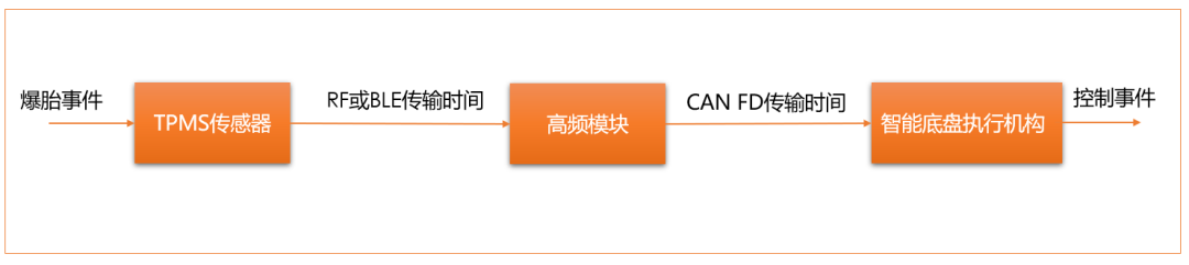 本产品经过了多轮软件设计和测试,平衡了内部电池消耗和爆胎触发时间,保证了产品爆胎预警的高时效性。从整车爆胎应用的层面来看,从爆胎事件发生到控制事件实施,如示意图所示,经过3个模块的处理以及2种通讯方式的传输,整个控制时间 300ms。