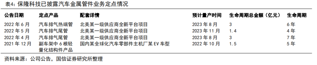除占比较高的汽车排气管件业务外,公司汽车金属管件领域布局汽车车顶架、金属支架、ERG管等产品,2018年与德国汽车液压成型专家——沙士基达液压成型(简称SZHF)签署合资协议,双方以51:49股权比例组建保隆沙士基达(安徽)液压成型有限公司,整合全球销售、研发和制造资源,瞄准开发宝马、奔驰和奥迪等国内知名合资车企,布局液压成型汽车结构件全球化业务。截至2023年,公司汽车金属管件业务收入已提升至14.2亿元,是公司第二大收入来源。近两年公司获得多份北美一级供应商汽车排气管件及国内新能源车型副车架结构件产品定点,披露定点金额近9亿。