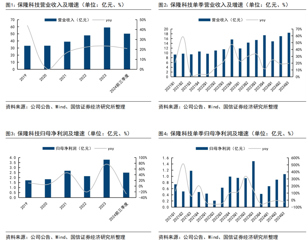 公司三季度收入同比+21%,业绩环比明显改善。保隆科技2024前三季度收入50.26亿元,同比增长20.96%;归母净利润2.49亿元,同比-26.62%;单季度看,24Q3实现营收18.43亿元,同比+20%,环比+8%;归母净利润1亿元,还原股权激励费用(0.34亿)后1.34亿元,同比-14%(去年同期存在2000万赔付及3000万投资收益),环比+14%,扣非净利润0.91亿元,同比有所下降,环比增长71%。