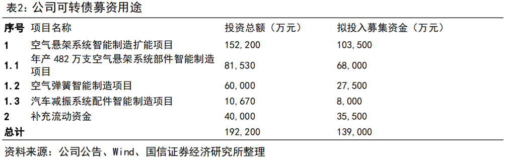 13.9亿可转债公告发行提示,公司扩产建设有望加速。10月30日,公司公告募资可转债发行提示,10月31日开启原股东优先配售认购日及缴款。本次可转债拟募资13.9亿元,其中10.4亿元用于空气悬架系统智能制造扩能项目,包含空悬系统部件智能制造、空气弹簧及减震系统配件,公司空悬业务有望加速兑现。