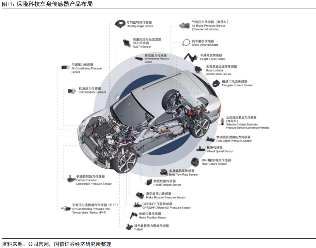 自研+并购,保隆形成6类40种传感器布局。保隆科技2009年开始研发压力传感器,2017年收购主攻速度类和位置类传感器常州英孚;2018年收购擅长刹车磨损传感器和变速箱位置传感器德国PEX,2022年收购上海龙感和常州英孚,增强速度位置类传感器能力。目前已形成汽车压力类、光学类、速度类、位置类、加速度类、电流类等6个品类、40多种产品,覆盖传感器平均单车价值量约1000元。